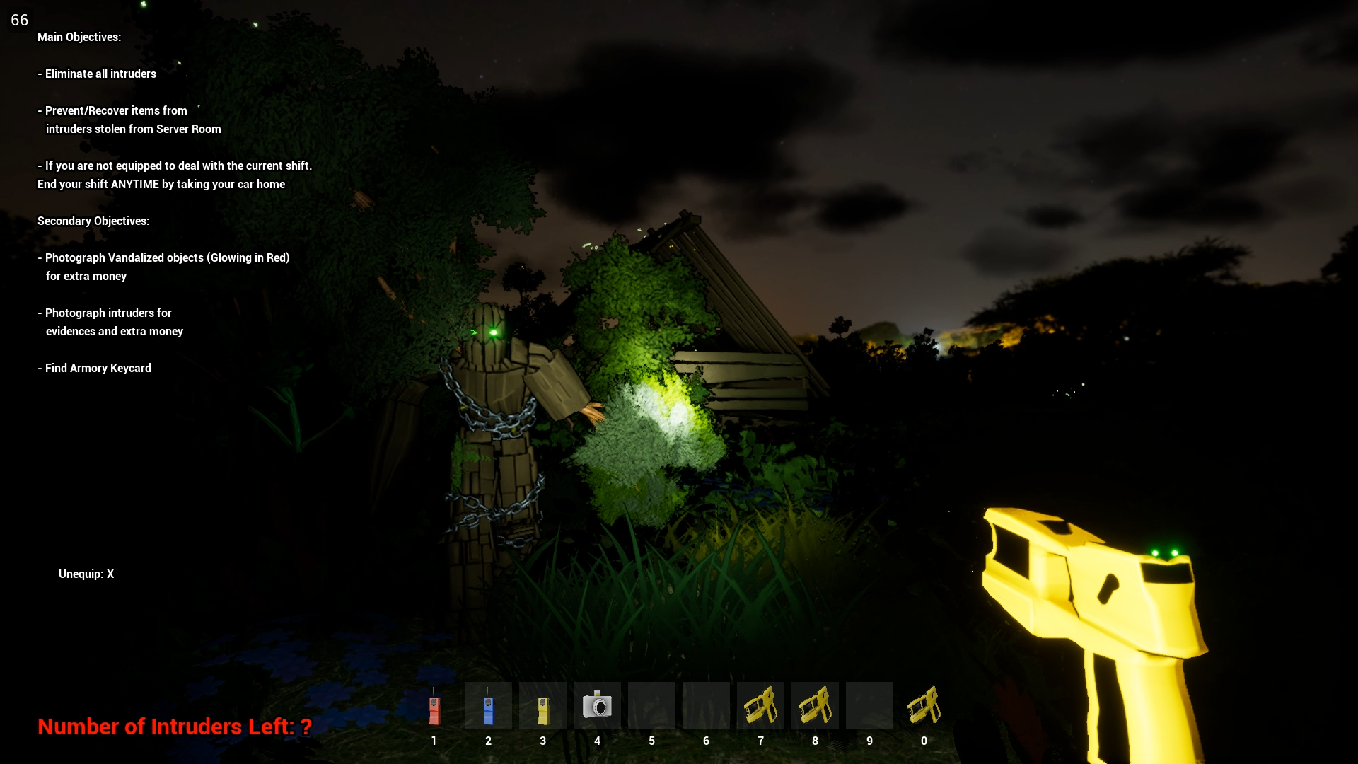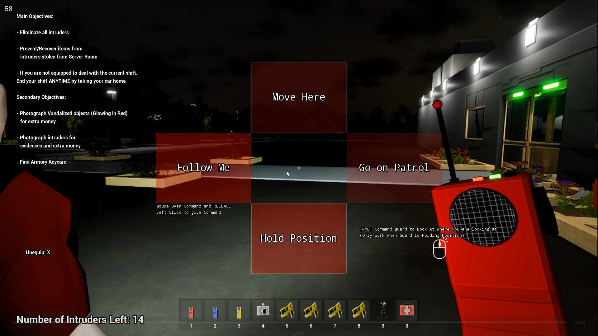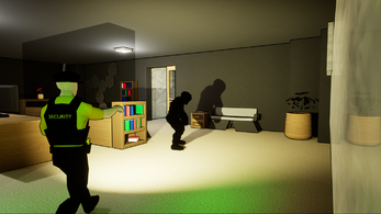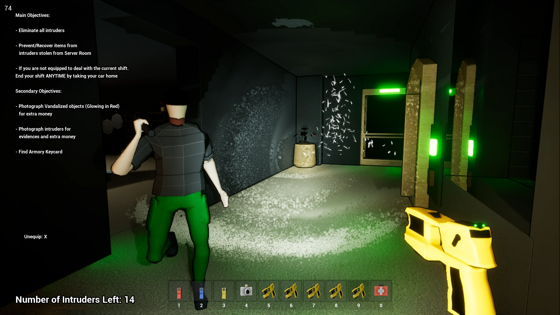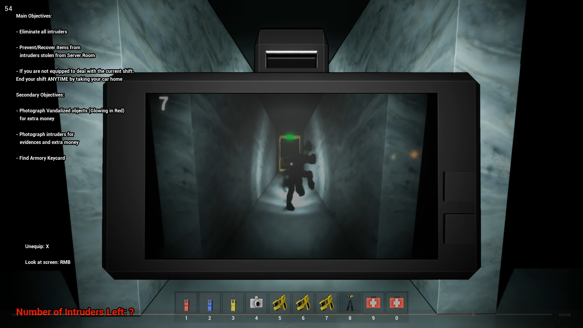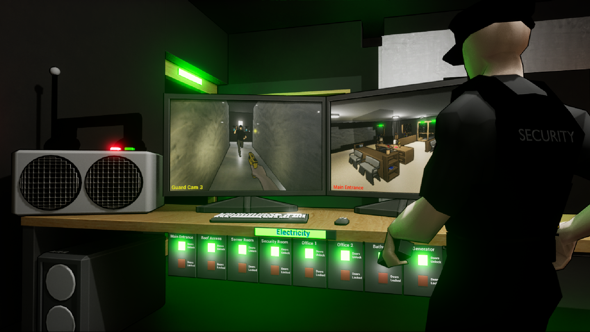 Core gameplay loop: monitor cameras, patrol the building, and deal with intruders using tools, hired guards, and your own judgment. What begins as routine security work gradually escalates beyond normal day-to-day human interactions as supernatural entities begin to emerge.